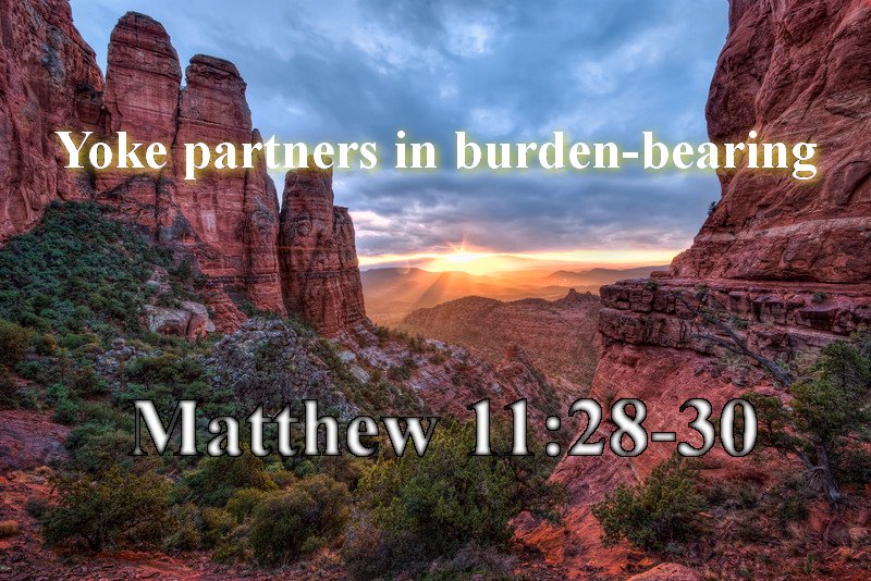 28 Come to me, all you are weary and burdened, and I will give you rest. 29 Take my yoke upon you and learn from me, for I am gentle and humble in heart, and you will find rest for your souls. 30 For my yoke is easy and my burden is light.”